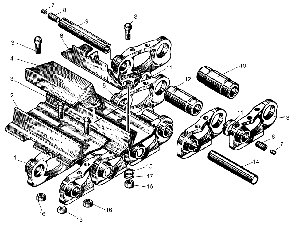 2 Для трактора с пятикатковой тележкой. 3 Для трактора с шестикатковой тележкой. 4 Для трактора с семикатковой тележкой. 5 В звено в сборе входят манжета ГМ-1-3 и звено 50-22-7 или 50-22-8 соответственно. 6 Применять совместно с замыкающим пальцем 24-22-7. 7 При установке асфальтоходных башмаков или шпор. | |||