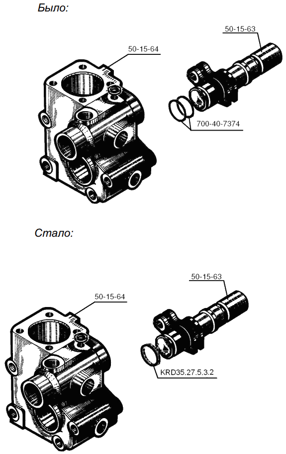 С целью повышения надежности уплотнения резиновые кольца 060-070-58-2-2 (между патрубком 50-26-277 и насосом НШ-100) и 018-022-25-2-2 (гидрораспределителя 50-26-61СП) заменены на кольца из резины на основе фторкаучука, с изменением обозначения на 050-070-58-2-5 и 018-022-25-2-5 соответственно и сохранением взаимозаменяемости.