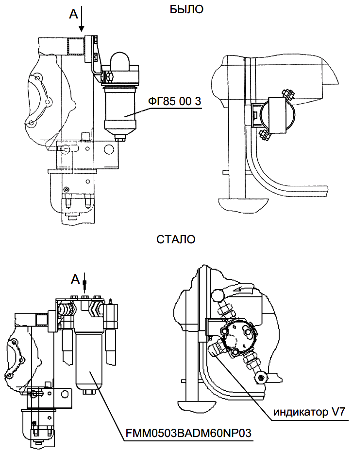 С целью улучшения операций техобслуживания установка фильтра грубой очистки топлива перенесена на маслораспределительную плиту, что повлекло за собой следующие изменения:
