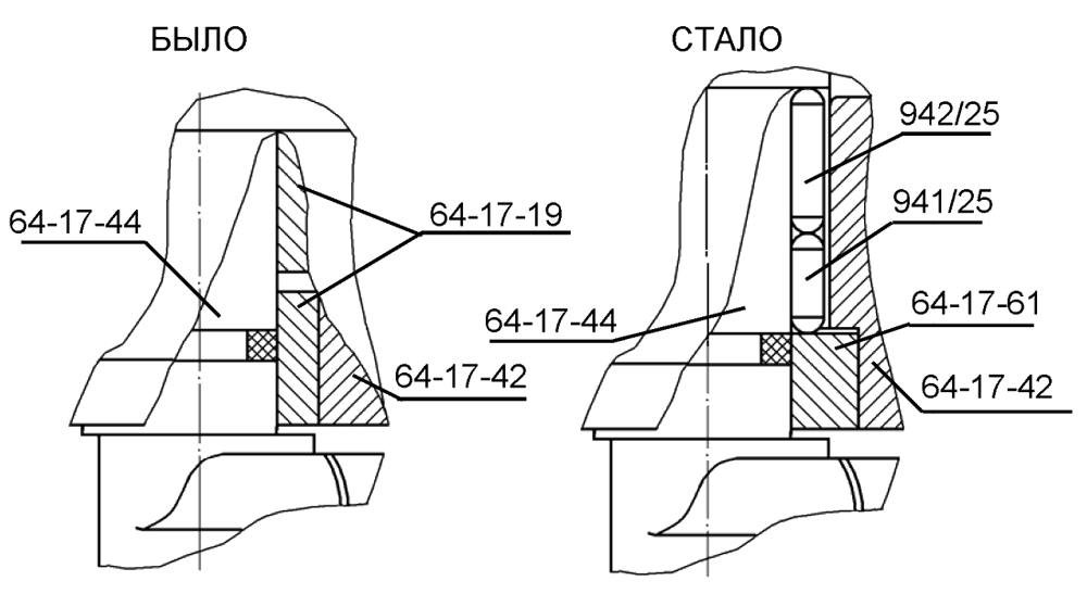В турбокомпрессор с целью повышения надежности уплотнения со стороны компрессора введено два уплотнительных кольца 51-54-10 вместо одного, с изменением посадочных размеров на кольце 51-54-15.