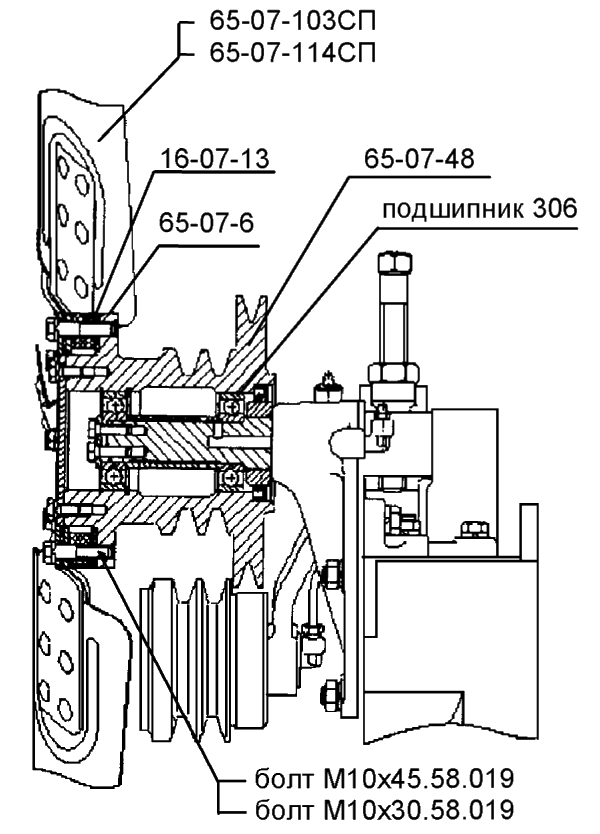 С целью повышения надежности и упрощения конструкции введено крепление стартера дизеля к кожуху маховика с помощью фланца 65-10-1 и поддерживающего кронштейна 65-10-2 взамен крепления с помощью кронштейна 59-10-6 и двух хомутов 16-25-102СП.