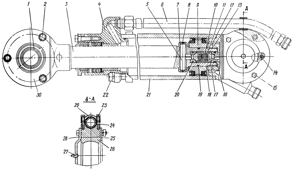 Отверните два болта 23 крепления бугеля к корпусу цилиндра, снимите бугель 29 и прокладку 24. Отверните накидную гайку трубы 6 и снимите трубу. Отверните болты.22 крепления крышки и выньте шток 3 с поршнем 9 из корпуса цилиндра вместе с крышкой 4 и деталями уплотнения. Сверните накидную гайку 13 и гайку 12 крепления поршня на штоке. Снимите со штока поршень 9. с деталями уплотнения.
