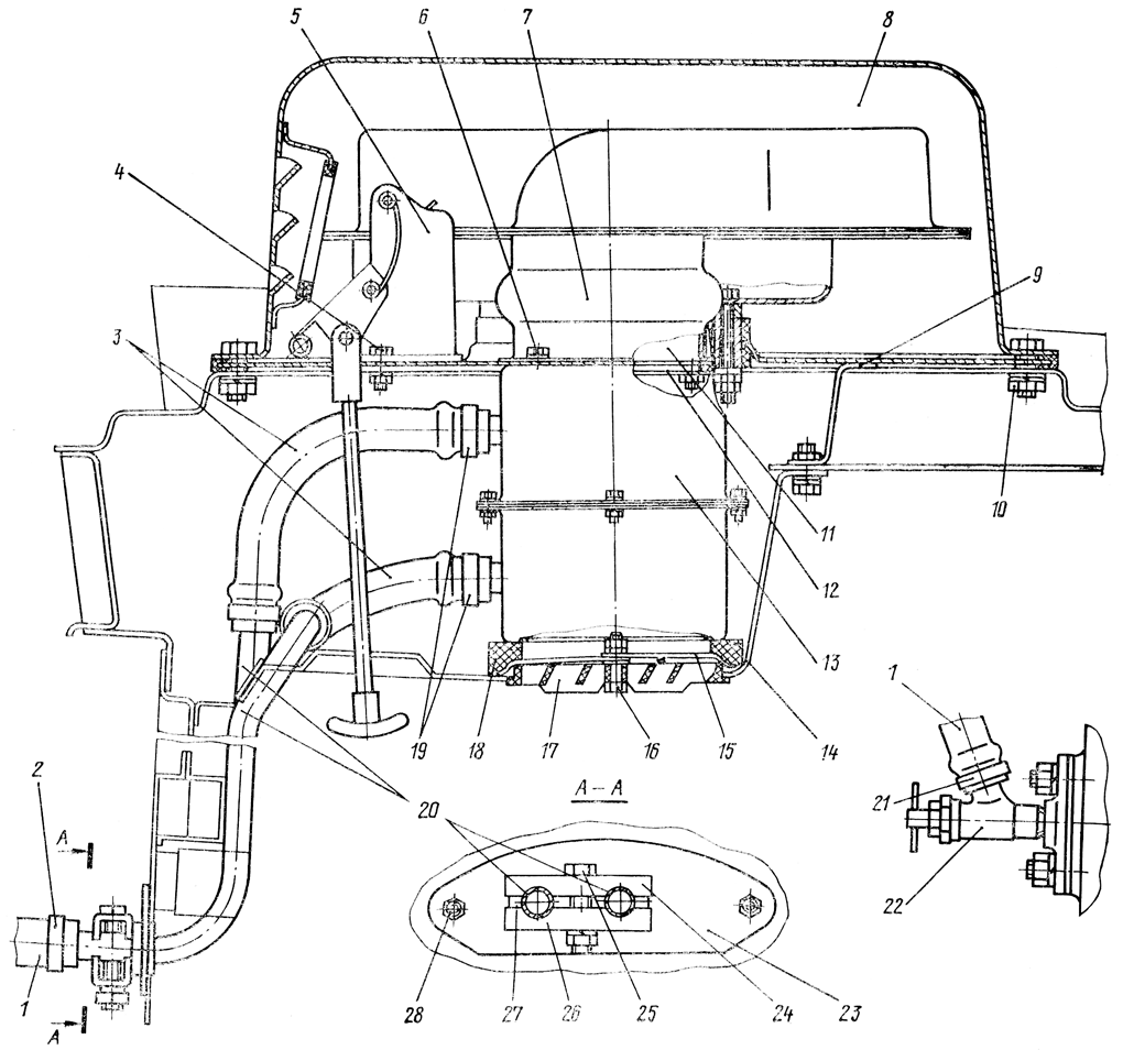 Сверните рукоятку 4 ( рис. 309 ) с тяги 3 включения теплообменника. Отверните две гайки 1 и снимите светозащитный козырек 2. Снимите опору зеркала с кронштейном, вывернув болт 8. Выверните три болта 6, два шурупа 9 крепления кожуха с воздухораспределителем 7 и снимите его. Удалите уплотнение 18 ( см. рис. 308 ) крышки кожуха теплообменника. Выверните болт; 16 и удалите зажим 15, воздухораспределитель 17 из кожуха 14. Снимите плафон освещения и обшивку крыши кабины. Снимите кожух 5 ( см. рис. 309 ) переднего электродвигателя стеклоочистителя и снимите с болта наконечник провода массы. Отсоедините провод от электродвигателя вентилятора. Ослабьте хомуты 19 ( см. рис. 308 ) и отсоедините рукав 3 от трубок радиатора теплообменника. Отверните восемь гаек 10 крепления отопителя и снимите его.
