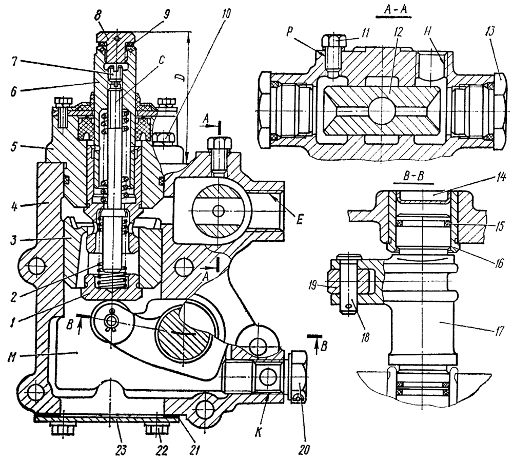 3. Давление в .полости золотника (контролируется по манометру) в конце хода клапана должно быть в пределах 4,9...6,5 МПа (50...65 кгс/см²). Регулируйте давление, вращая стержень С относительно штока клапана отверткой, вставленной в шлиц стержня. При вращении стержня против часовой стрелки (если смотреть в отверстие штока) давление увеличивается, по часовой стрелке-давление уменьшается. По окончании регулирования законтрите стержень С винтом 7.