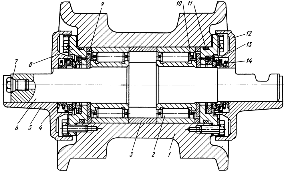 Полость натяжного колеса уплотнена резинометаллическим сальником 5, аналогичным применяемому в опорных и поддерживающих катках и отличающимся размерами.
