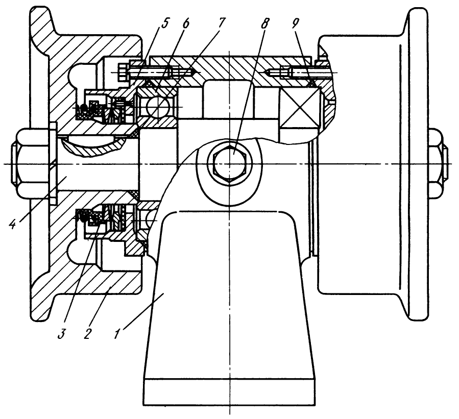 В расточку опоры 3 запрессованы две втулки 5, в которых проворачивается палец 4 балансирного устройства. Палец вмонтирован во втулки 9, установленные в кронштейнах коробки 5 рессоры. От осевого перемещения палец удерживается замковыми кольцами. При сборке внутренние полости пальца и опоры заполняют густой смазкой.
